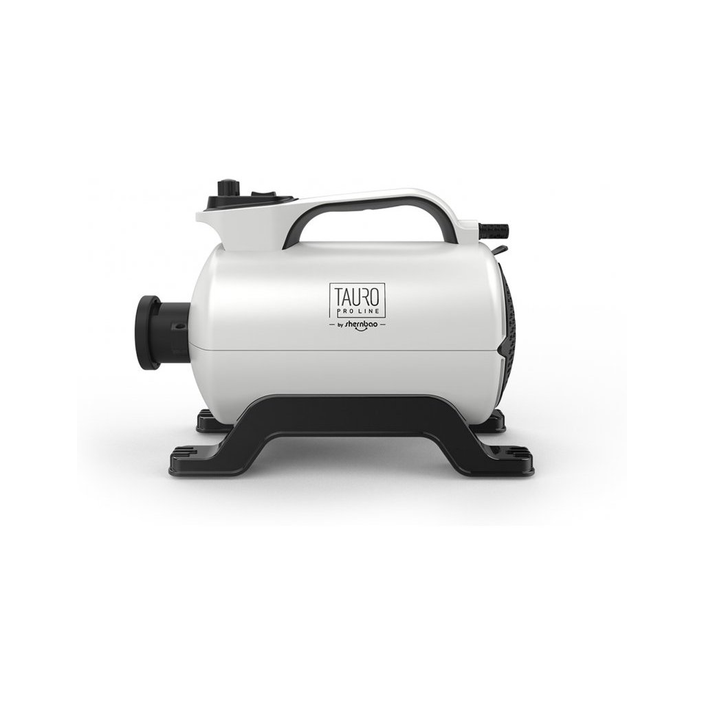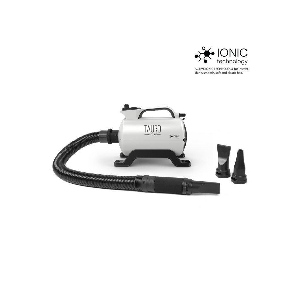 Přenosný foukač Tauro Pro Line s integrovanou iontovou technologií je malý, lehký a moderní ideální pro každodenní profesionální použití. Je vybaven technologií 4v1 – nabízí výkonné vyfoukávání vody, účinné sušení a rozplétání srsti bez použití kartáče, plus iontová technologie. Je přenosný, kompaktní, lehký a výkonný, lze jej použít doma, na výstavách nebo v mobilních salonech. Čím je iontová technologie výjimečná? Tato technologie generuje záporné ionty, které pomáhají eliminovat statický náboj na srsti. Srst vašeho mazlíčka je velmi jemně vysoušená, takže je měkčí a má extra lesk. Iontová technologie také napomáhá rychlejšímu odpařování vody, takže srst je vystavena menšímu působení tepla. To vám umožní udržet srst zdravou a zářivou. Vysoušeč srsti s integrovanou iontovou technologií snižuje elektrostatický efekt srsti a zkracuje proces sušení, takže srst lze efektivněji ošetřovat, česat a tvarovat. Obsah balení: 1/ široká tryska pro široké šíření proudu vzduchu a rychlejší sušení větší plochy, 2/ kulatá tryska pro soustředění proudu vzduchu na menší plochu, 3/ úzká tryska, která soustřeďuje a zesiluje proud vzduchu, umožňuje extrémně rychle vysušit mokrou srst, vyfoukat uvolněnou podsadu a narovnat srst, 4/ hadice s rukojetí na ochranu před horkem, která zajišťuje pohodlné uchopení fénu a umožňuje soustředit se na sušení srsti domácího mazlíčka. Flexibilní hadice a různé trysky umožňují nastavení síly a koncentrace proudu vzduchu a přizpůsobení různým typům srsti. Hadici a filtr lze snadno vyjmout, vyčistit a připojit. Rukojeť hadice je potažena žáruvzdorným neoprenem pro pohodlnou práci i při delším používání. Tento foukač má jeden výkonný motor s výkonem 2200 W, který předčí i některé dvoumotorové foukače. Zlepšená síla proudění vzduchu a tření umožňují foukači dosáhnout vyššího energetického poměru, což má za následek úsporu energie až 30 %. Tento foukač má pokročilý design vnitřní cirkulace vzduchu a vzor proudění, který zajišťuje vysoký průtok a objem vzduchu a rychlé výsledky při sušení. Díky nastavitelnému proudění vzduchu, od pomalého až po extra silný, je sušení srsti vašeho mazlíčka čistým potěšením a hlavně pro něj pohodlné. Dva režimy teploty vzduchu – teplý a studený. Vylepšený vnější design s elegantním leštěným povrchem.