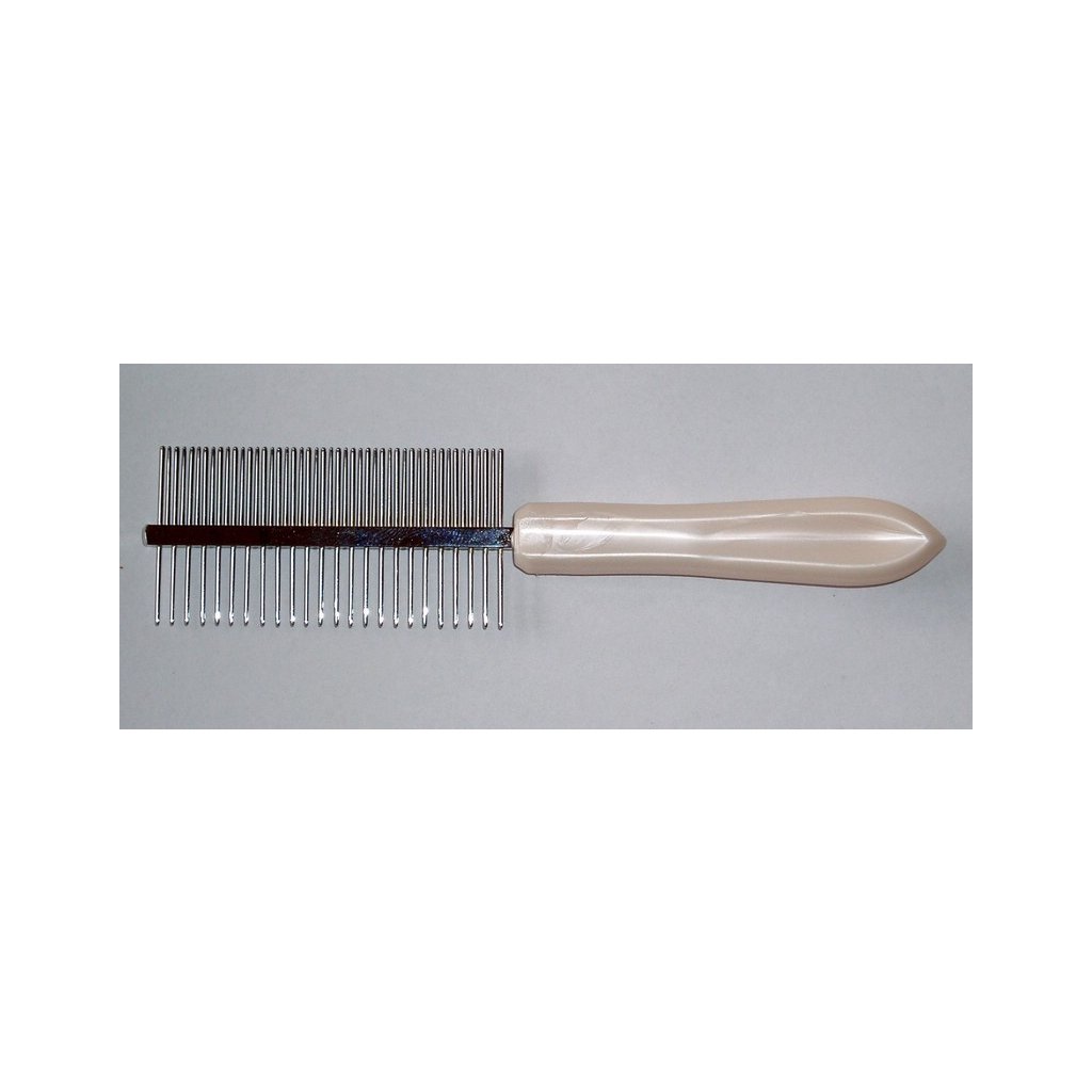 Malý kovový hřebínek s perleťovou plastovou rukojetí oboustranný. Výborný na česání malých psů a koček.