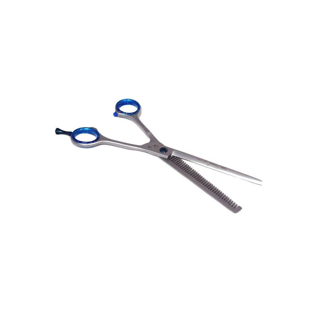 Efilační nůžky jednostranné, délka 17cm, dodávané s opěrkou a modrými kroužky, vhodné na domácí použití pro chovatele i pro začínající salony.