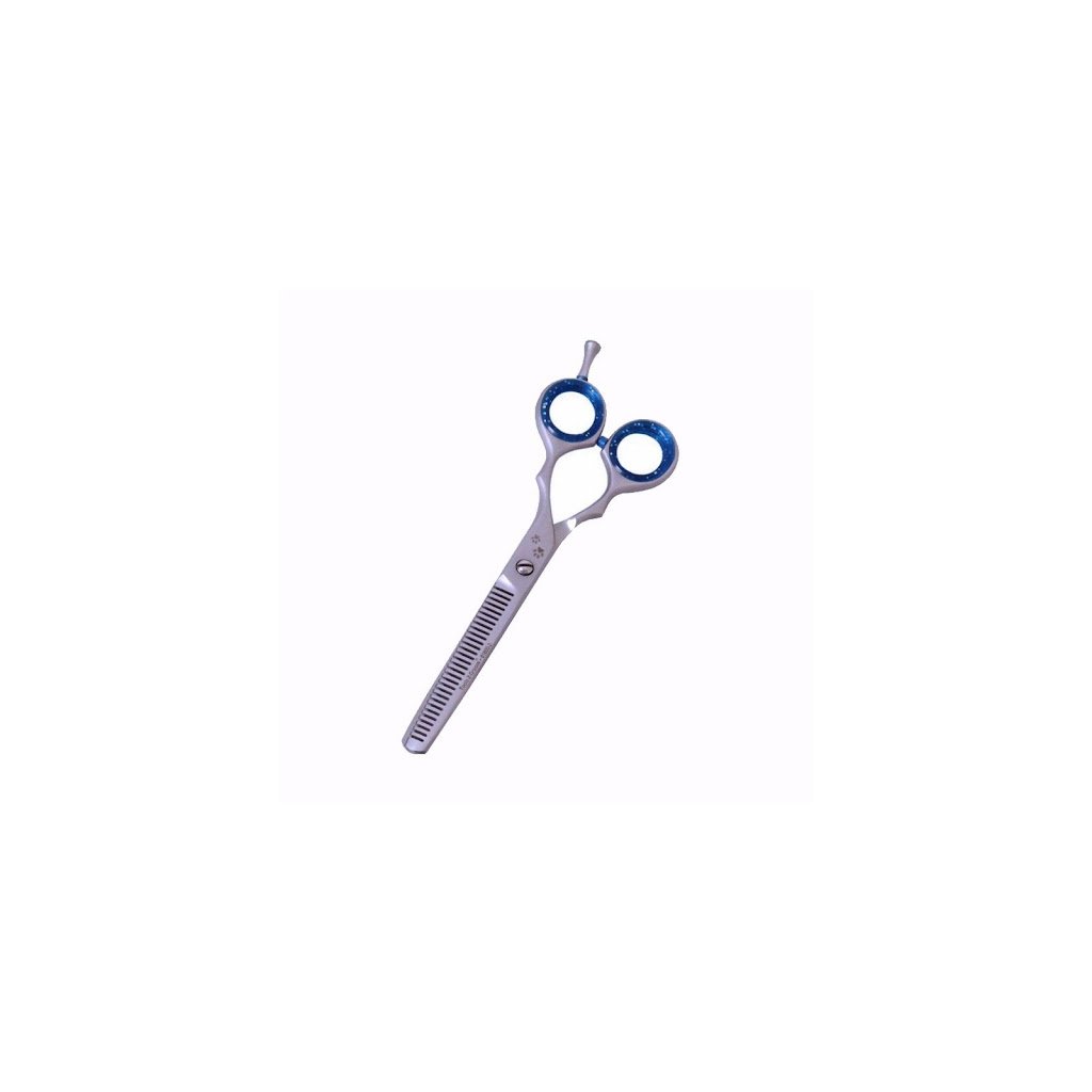 Efilační nůžky oboustranné, délka 17cm, dodávané s opěrkou a modrými kroužky, vhodné na domácí použití pro chovatele i pro začínající salony.