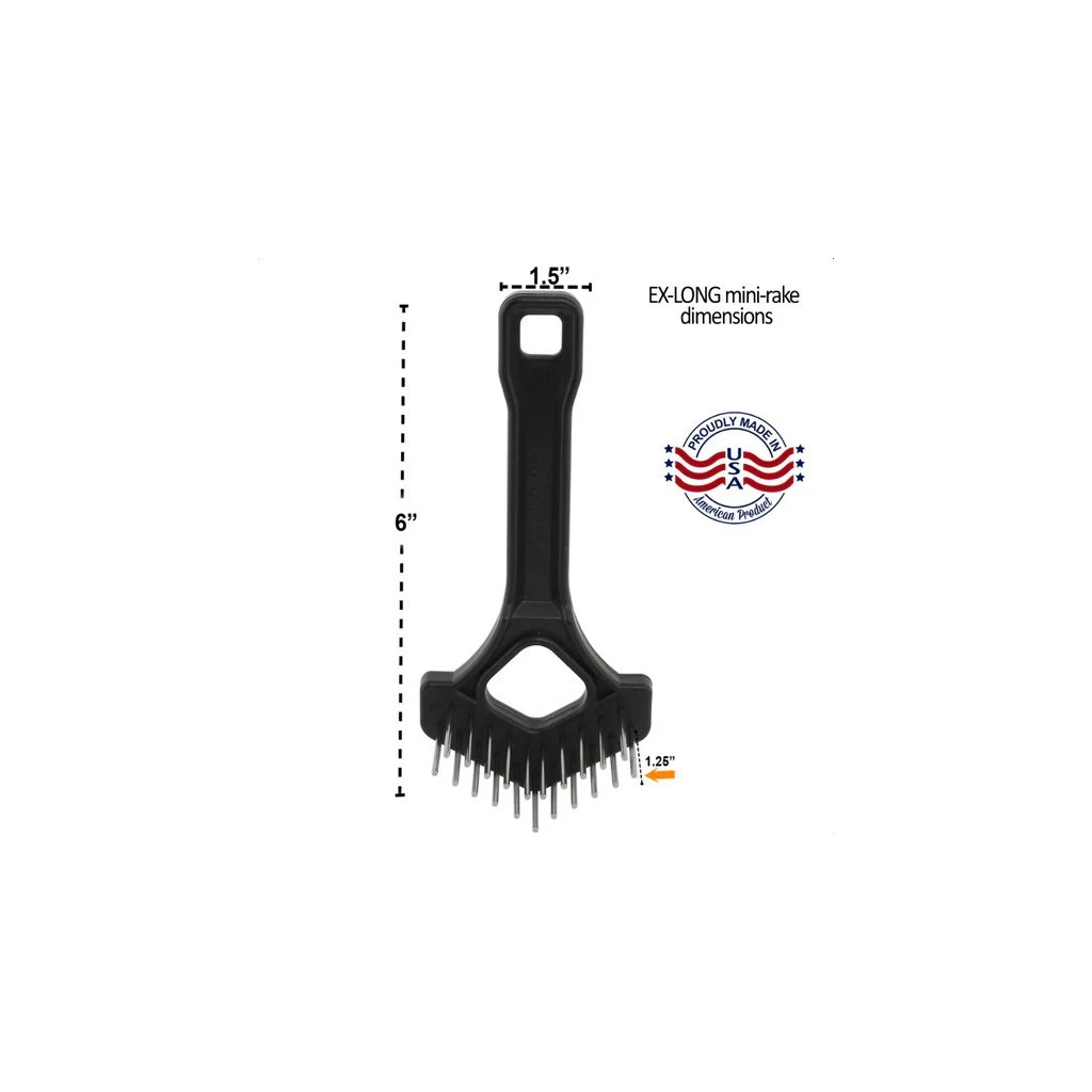 Dvouřadý hřeben V-Shape s extra dlouhými zuby Mini Rake čistí do hloubky. Extra dlouhé zuby o délce 1,25″ dosáhnou až k pokožce a odstraní malé chomáče a uvolněné chlupy. Výjimečný pro citlivé oblasti včetně obličeje, krku, za ušima, podpaží a ocasu. Krátká rukojeť o délce 6″ se snadno používá u malých i velkých plemen a koček. Veterináři doporučují střídat nástroje s různými zuby pro každodenní čištění a péči, což snižuje počet návštěv u groomera a veterináře.