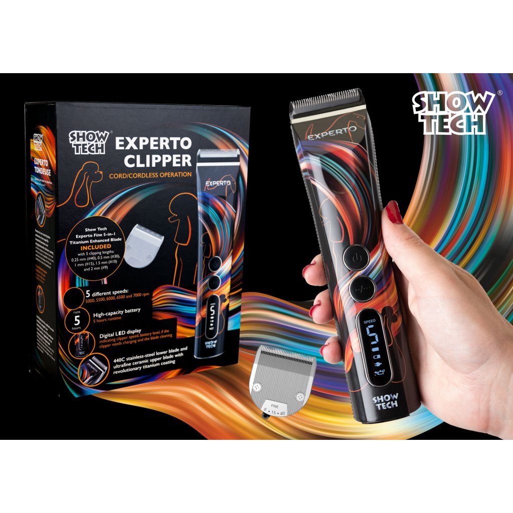 Nová generace profesionálních strojů, které navrhla Kitty Dekeersgieter. Strojek má nízkou hmotnost a silný rotační motor, na výběr máte 5 různých rychlostí, které vidíte na LCD displeji. Strojek Experto je vybaven spodní čepelí z nerezové oceli a extrémně jemnou horní keramickou čepelí s titanovým povrchem. Keramika zaručuje menší přenos tepla a menší tření, takže můžete stříhat déle než jste zvyklí. Výkonná baterie vydrží až 5 hodin v kuse. Součástí dodávky je: Čepel Show Tech Experto Fine 5-in-1 Titanium Enhanced s 5 různými délkami: 0,25 mm (#40), 0,5 mm (#30), 1 mm (#15), 1,5 mm (#10) a 2 mm (#9). Hmotnost strojku s hlavicí 285 g.