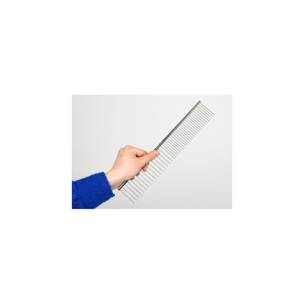 Klasickě, velmi oblíbené hřebey, s kulatým držadlem dvojí hustoty hrotů napůl husté a řídké vhodné i na rozčesávání cucků. Vysoce kvalitní multifunkční hřebeny vzdálenost mezi zuby je kombinace řidký/hustý . Doporučuje se pro všeobecné použití a pro zvedání srsti před nůžkami. Návod k použití: Hřeben vedeme ve směru růstu srsti.