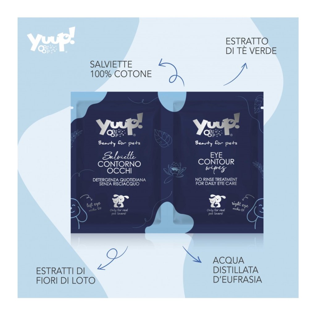 Utěrky Kolem Yuup Eyes! jsou jednorázové čisticí utěrky speciálně formulované pro každodenní a jemné čištění periokulární oblasti psů a koček. Vyrobené z přírodní bavlny, jsou namočené extrakty ze zeleného čaje a Lotusových květin, známé pro své uklidňující a osvěžující vlastnosti.